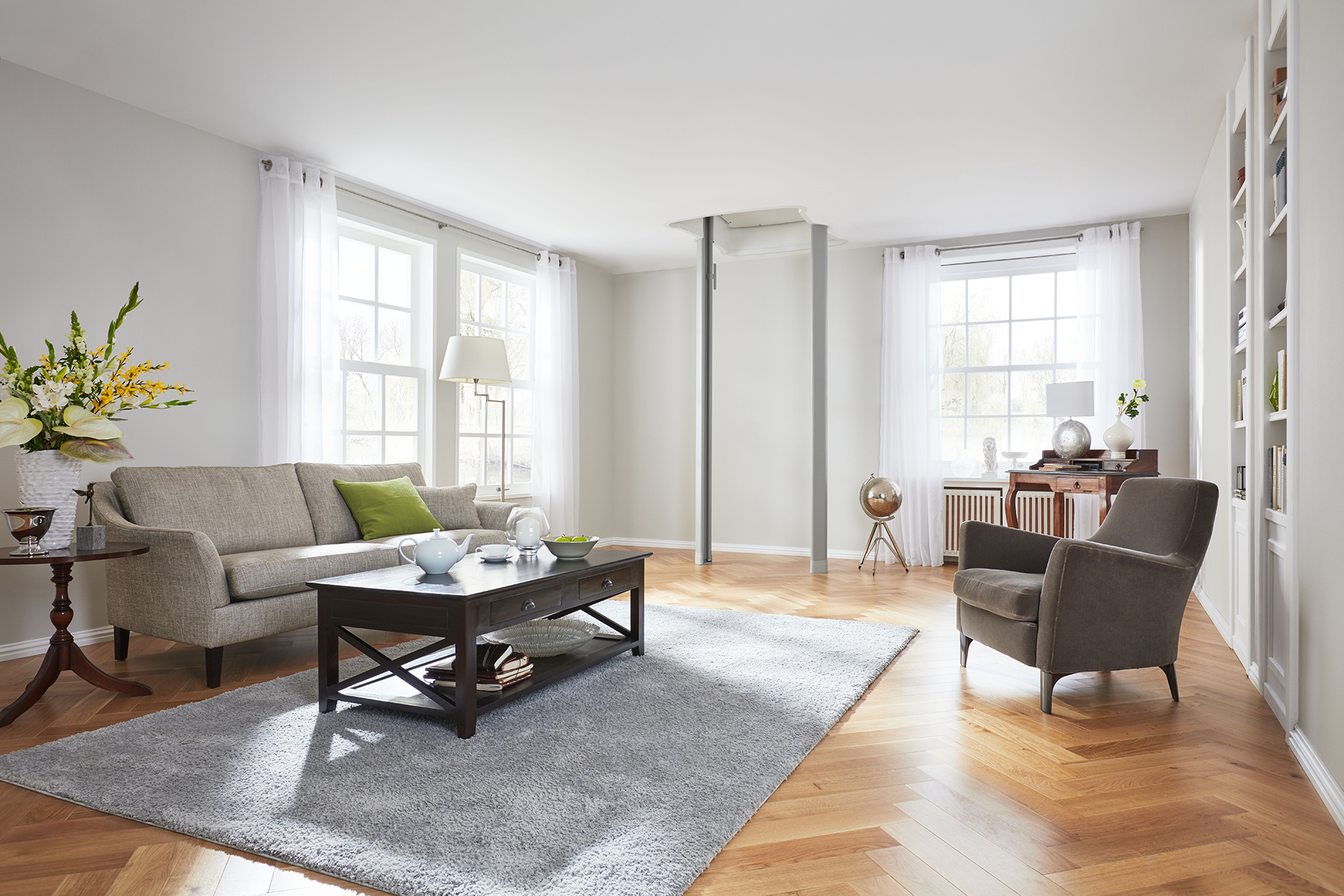 Ein Homelift beeinflusst nicht die Ästhetik des Raums. Parkt der Lift in einer anderen Etage, sind lediglich die Schienen sichtbar – der Deckenausschnitt verschließt sich automatisch.